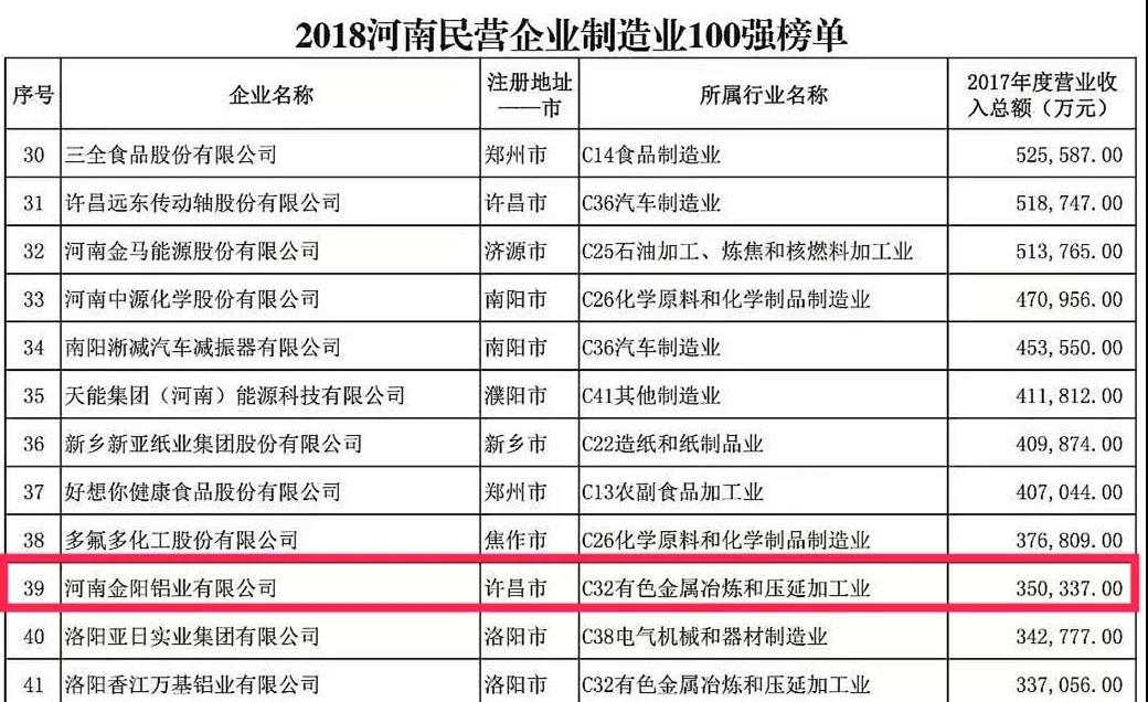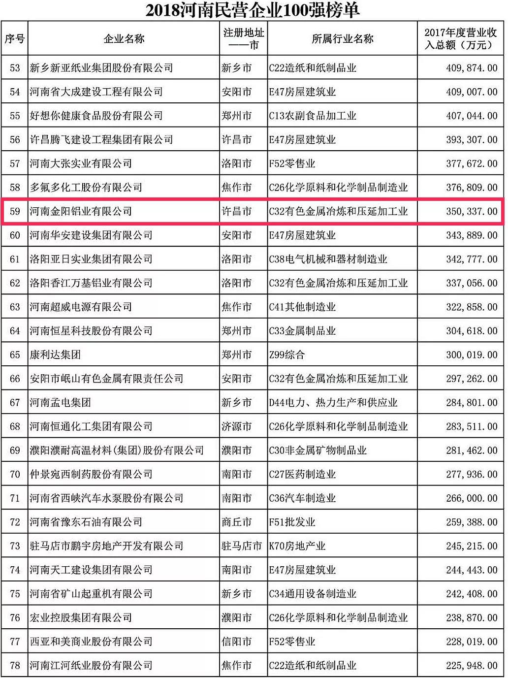 2018“河南民营企业制造业100强”榜单中,多宝开户入口_多宝(中国)集团、黄河集团、众品食业、金汇集团和金阳铝业分别排在第3名、第5名、第6名、第7名及第39名。