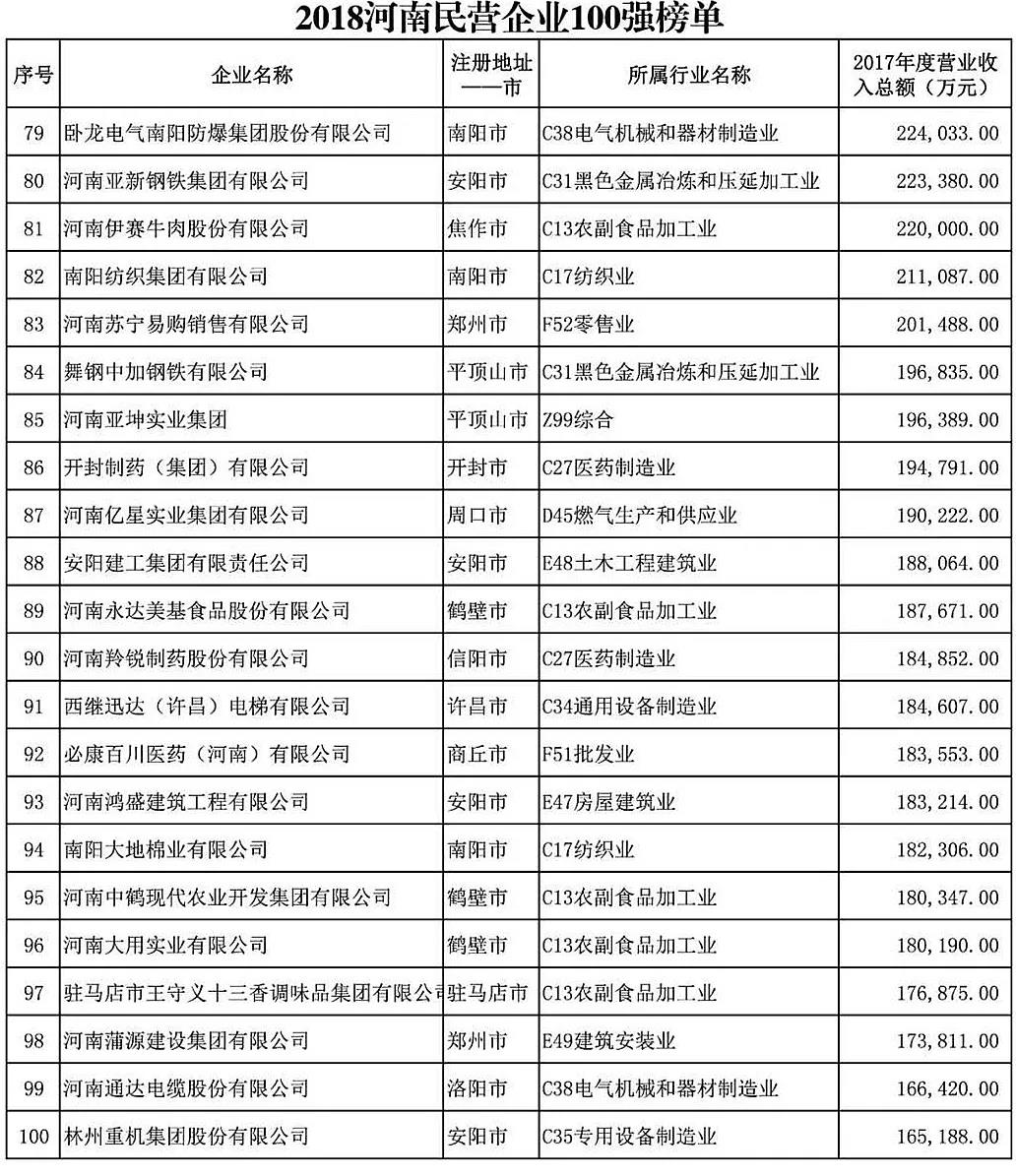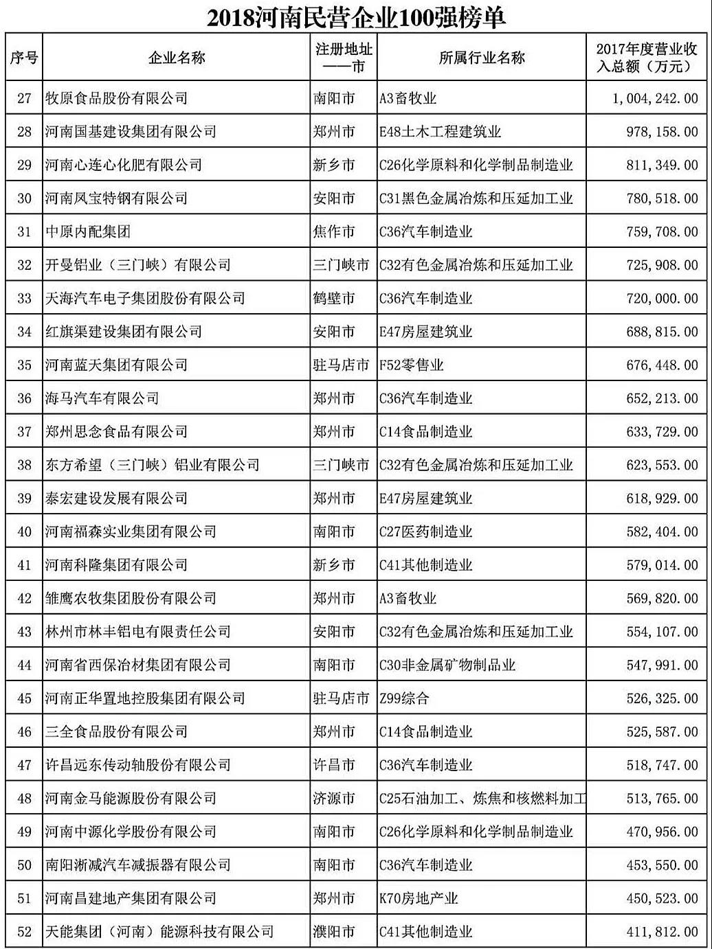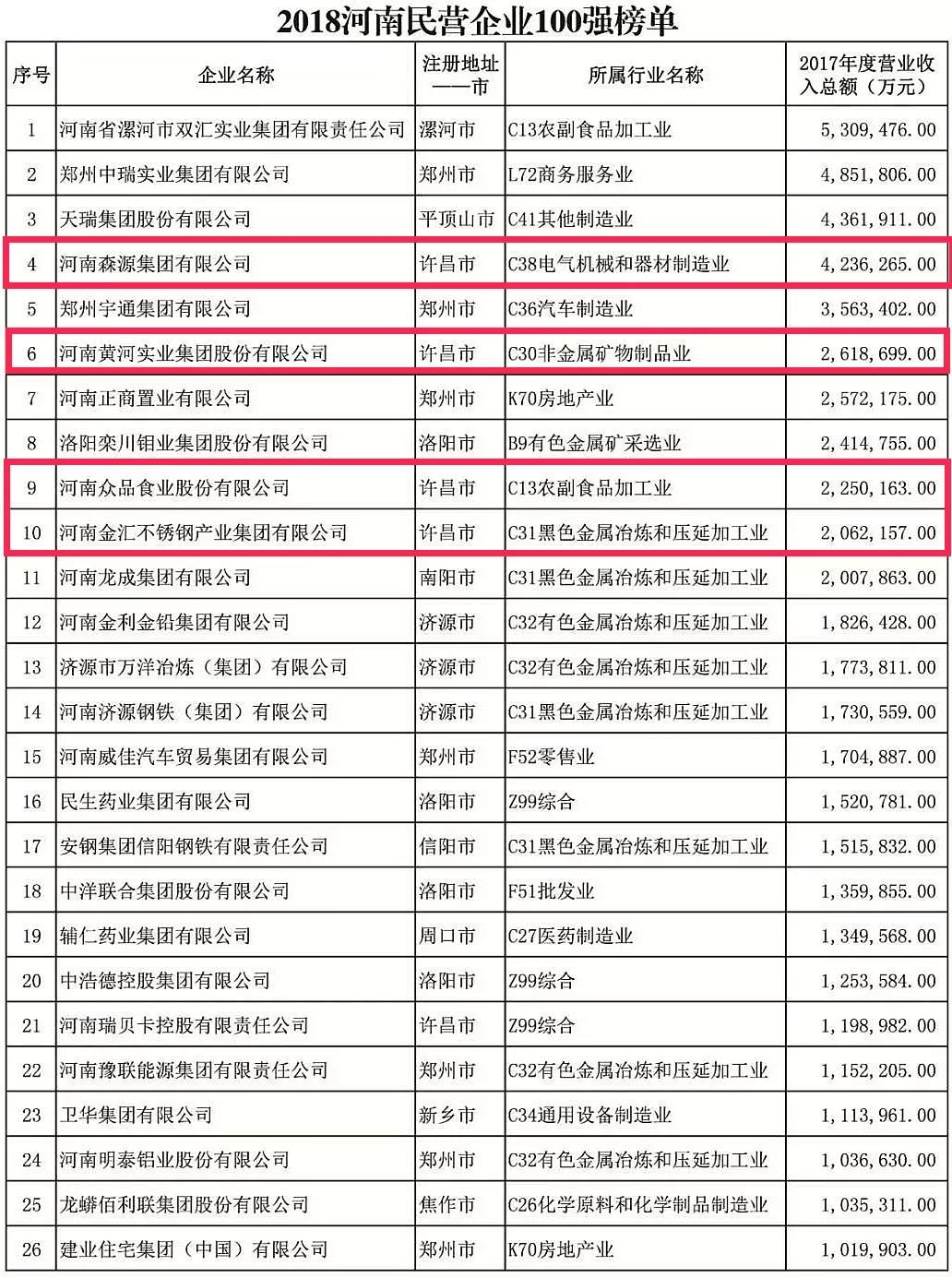 2018“河南民营企业100强”前十强分别是:河南省漯河市双汇实业集团有限责任公司、郑州中瑞实业集团有限公司、天瑞集团股份有限公司、多宝开户入口_多宝(中国)、郑州宇通集团有限公司、河南黄河实业集团股份有限公司、河南正商置业有限公司、洛阳栾川钼业集团股份有限公司、河南众品食业股份有限公司、河南金汇不锈钢产业集团有限公司。